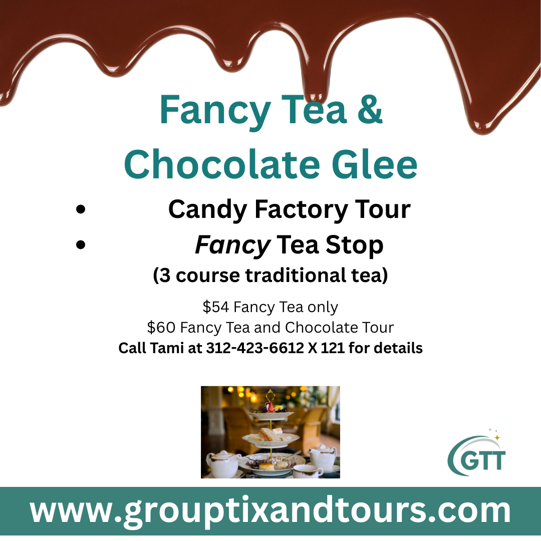 This decadent tour includes a 90 minute traditional english Tea with Gerri in Long Grove, followed by a 45 minute chocolate factory tour in Buffalo Grove, Illinois.
